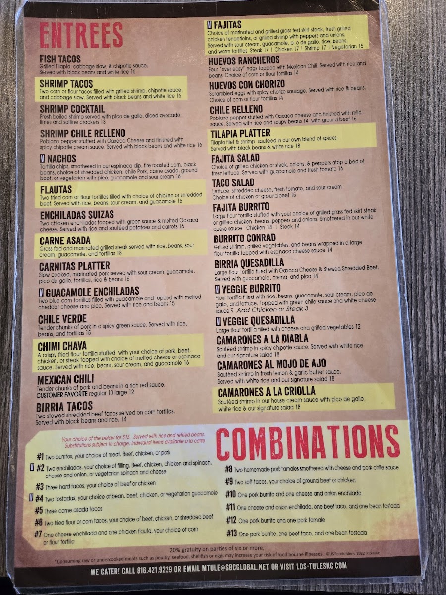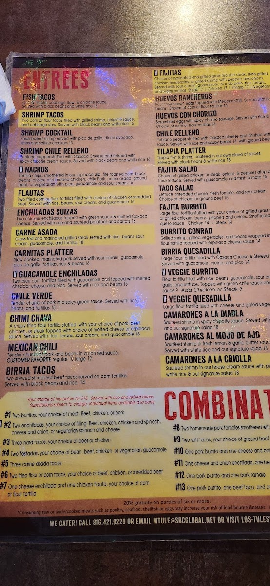 Welcome to Los Tules, a vibrant culinary gem nestled in Kansas City. This restaurant offers a delightful journey into authentic Mexican flavors, with a menu designed to satisfy diverse cravings. Start your meal with enticing appetizers like the House Special Queso Dip, a comforting blend of cheese and sauced pork, or the refreshing Ceviche featuring marinated tilapia and shrimp. As for entrees, the Grilled Tilapia Fish Tacos come highly recommended, delivering a perfect balance of freshness topped with zesty chipotle sauce. For those who prefer classics, the Enchiladas Suizas are a must-try, with tender chicken enveloped in rich green sauce and melted Oaxaca cheese. The casual ambiance, coupled with attentive service, enhances the experience, making it a perfect spot for gatherings or a cozy dinner. From the scrumptious food to the delightful margaritas, Los Tules is truly a place where flavors flourish and good times unfold.
